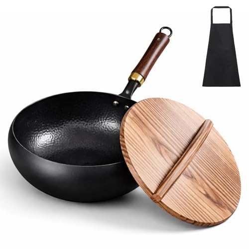 Nonstick Wok Pan with Lid, 9.4 in Uncoated Iron Pot, Iron Frying Pan with Wooden Handle for Electric Stoves, Induction Cookers and Gas Stoves