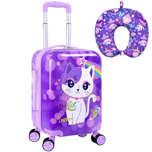 Lightweight Hardshell Spinner Suitcase Set for Kids 2PCS with Wheels - Airplane Approved Carry-On Luggage for Girls& Children Ages 3-10, Purple Cat Rolling Suitcases for Elementary Toddler Travel