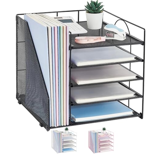 Samstar Mesh Desk File Organizer Letter Tray Holder, Desktop File Folder Holder with 3 Paper Trays and 2 Vertical Upright Section, Black.
