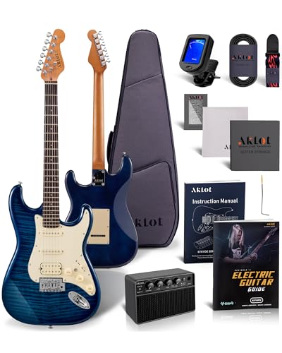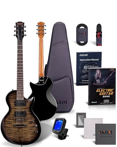AKLOT Stryde Electric Guitar with Coil-Split: Roasted Maple Neck, Flame Maple Graphic Top, HSS Ceramic Pickups, Beginner Guitar Kit with 10W Amp, Gig Bag, Strap, Picks, Lesson Book, Obsidian Black