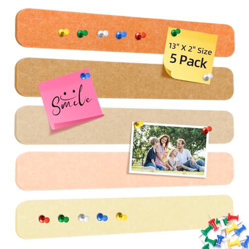 HAUTOCO Cork Board Bulletin Board Bar Strips 5-Pack 13"x2" Self Adhesive Felt Pin Board with 20 Push Pins for Home Office Bedroom Door Wall Decor, Linen Mix