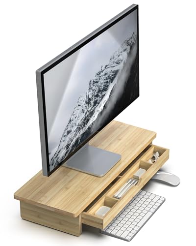 FENGE Monitor Stand, Dual Monitor Riser, 42.5inch Large Desk Computer Monitor Stand Riser with Drawer, 2 Tier Wood & Acrylic Desktop Organizer for Computer, Laptop, Printer, TV Screen Riser Oak