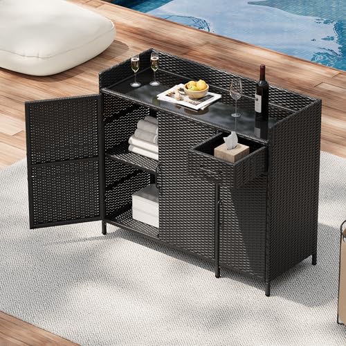 Siemd Outdoor Kitchen Island with Rolling and Storage Cabinet, Solid Wood Outdoor Grill Table with Stainless Steel Top & Spice Rack & Towel Rack, Black