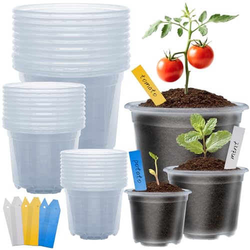 36 PCS 5/6/7 Inch Reinforced Clear Nursery Pots with Adjustable Drainage Multi-Size Reusable Plant Containers for Indoor Gardening, Hydroponic Starter Kits with 20 Durable Plant Labels