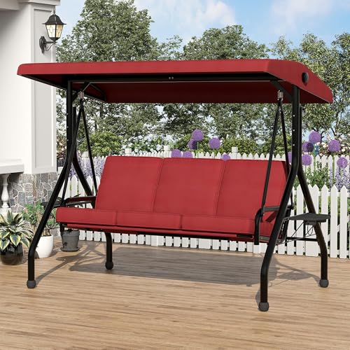 MELLCOM Outdoor Patio Swing with Hardtop, 3 Person Porch Swing with 2 Side Cup Holder, Convertible Backrest Swing Bed with Cushion, 2 Pillows for Front, Porch, Lawn, Khaki