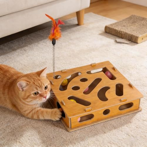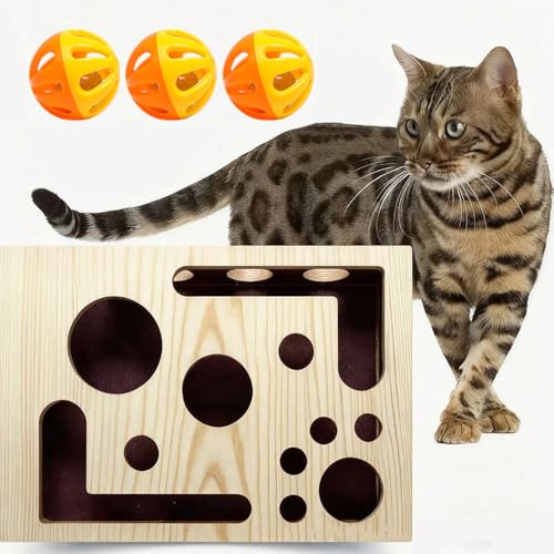 Sinbana Cat Scratch Puzzle Enrichment Box with 3 Bell Balls, Interactive Wooden Cat Nail File Toy & Scratcher with Sandpaper Inside Stress Free Nail File for Indoor Cats