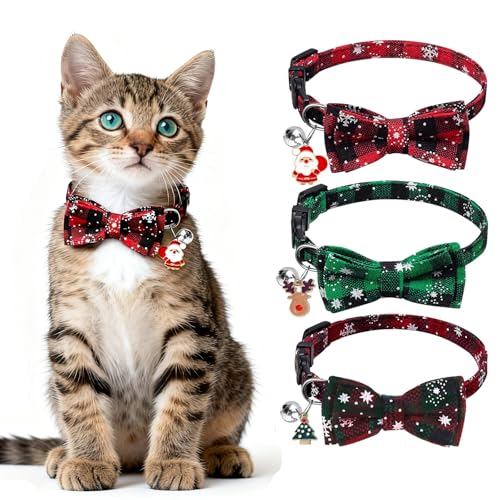 2pcs Christmas Cat Collar, Christmas Breakaway Cat Collars Cute Cat Collar with Bow Tie Festive Cat Collar with Bells Removable for Cats Pets (Red, Green)