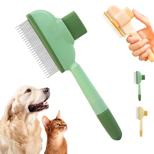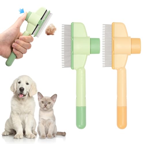 Cat Brush & Dog Brush Self-Cleaning Pet Hair Removal Tool with Long & Short Stainless Steel Teeth, Flea Comb for Shedding, Detangling, and Grooming for Cats & Dogs (Green+Yellow)