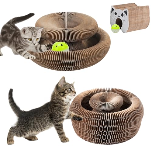 Kitty Curls Scratcher Cat Toy, Magic Organ Cat Scratch Board Foldable Accordion Cat Toy Recyclable Scratch Pad with Toy Bell Ball and Dental Sticks Interactive Mental Physical Exercise for Cats