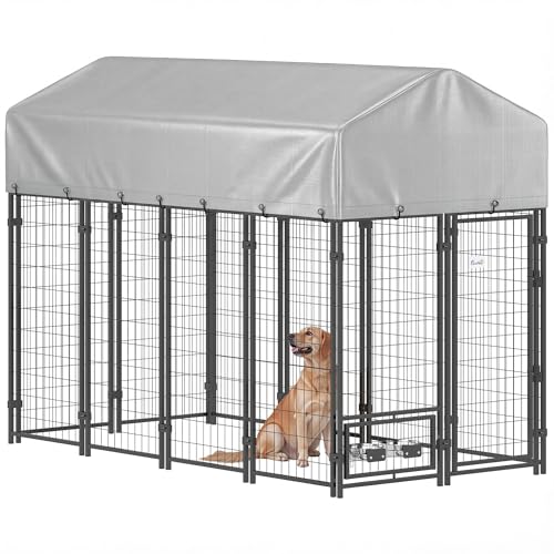 PawHut Outdoor Dog Kennel, Run, Large Wire Steel Fence, Lockable Pet Playpen Enclosure, with Water-, UV-Resistant Canopy Top, Door, Rotating Bowl Holders, 8ft x 4ft x 6ft, Red