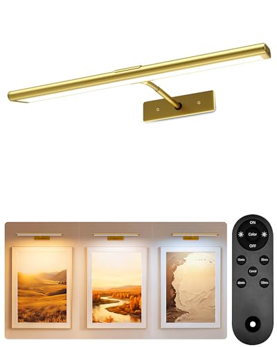 Picture Light Battery Rechargeable, 3Pack Picture Light for Wall with Remote, 3 Color Modes and Dimmable Classic Art Lights for Paintings, Pictures in Gallery, Bedroom, Bathroom with Timer Brass