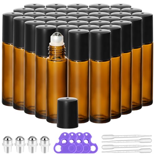 Aqziill 36 Pack Empty Essential Oil Roller Bottles 鈥 10ml Amber Glass Roll-On Bottles with Stainless Steel Roller Balls & Caps, Refillable Perfume Containers for DIY & Travel锛圓mber锛