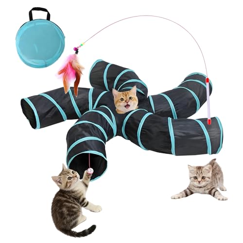 Wondfamiker Cat-Tunnel Tube-Toys for Indoor-Cats - Collapsible Peekaboo Play Tube with Hanging Bell Tear Resistant Polyester Interactive Cat Toys with Feather Wand for Kittens Rabbits Puppy (5 Way)