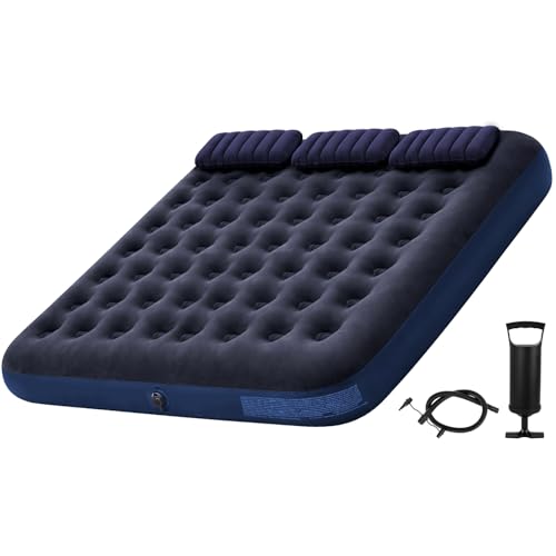 King Size Air Mattress with Hand Pump and 3 Inflatable Pillows, 200 x 183 x 22 cm Inflatable Air Bed, Extra Large Flocked Air Mattress for Camping Travel and Guest Use