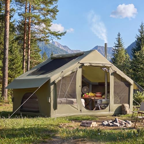 Inflatable Camping Tents with Pump, Air Glamping Tents, Easy Setup Waterproof and Windproof Blow up Tent, 4 Seasons Oxford Cabin Tent with Mesh & Chimney Window.