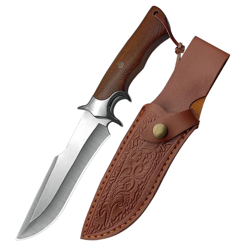 Outdoor Hunting Knife for Men - Full Tang High Carbon Stainless Steel Survival Knife with Wood Handle, Fixed Blade, Leather Sheath