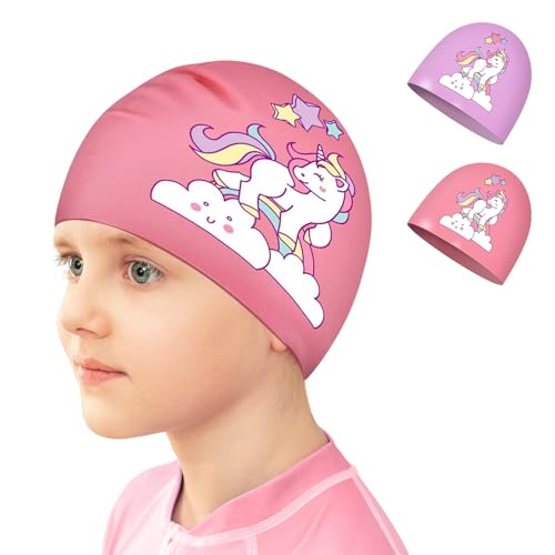 Kids Swim Caps for Girls (Age 2-6), Durable Waterproof Silicone Swimming Cap for Short Hair with Swimming Goggles, Ear Plug and Nose Clip