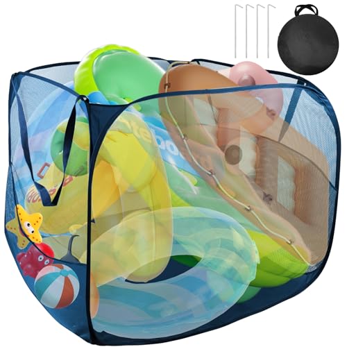 Pop up Pool Toy Storage Bin,32"X32"X30"Pool Float Organizer Bag with 2 Side Pockets Mesh Swimming Pools Toys Organizer with 4 Ground Nails for Inflatable Toys, Float, Beach Ball and Pools Accessories