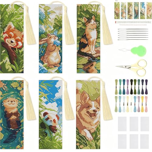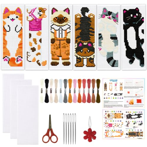 ORIGACH 6 Set Cute Cat Cross Stitch Bookmark Kit for Beginner with Backing Felt Floss Instructions DIY Stamped Embroidery Bookmark Kit for Adults, Book Lovers