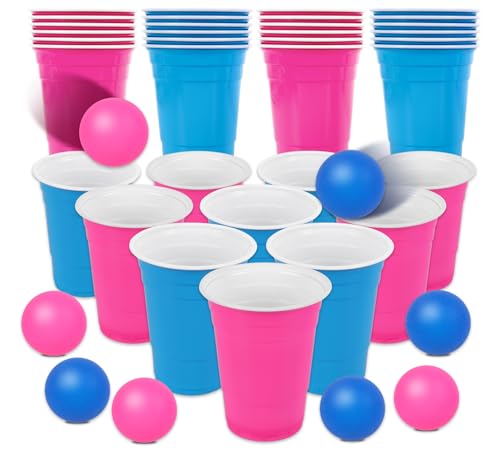 JarThenaAMCS 32Pcs Cup Table Tennis Game Set 22 Blue & Pink Plastic Cups 10 Ping Pong Balls for Gender Reveal Party Game Supplies