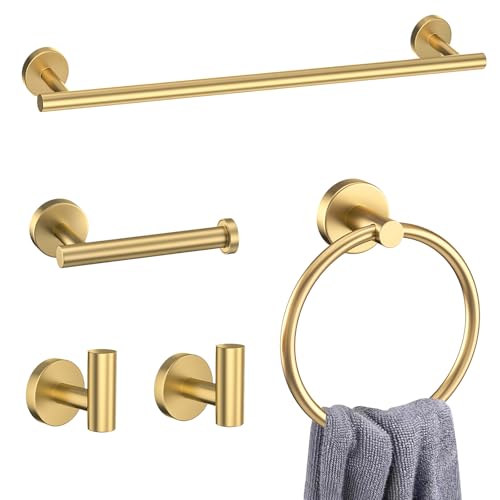 Self-Adhesive Bathroom Hardware Set, Towel Ring, Toilet Paper Holder and 2 Towel Hooks for Kitchen/Bathroom, No-Drilling Stainless Steel Bathroom Accessories, Wall Mounted, Gold