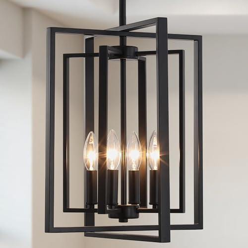 AMZASA UL Listed Black Industrial 4 Light Lantern Chandelier Ceiling Light Fixtures Farmhouse Metal Cage Rustic Geometric Pendant Light for Kitchen Island Entryway Dining Room Stairs and Hallway