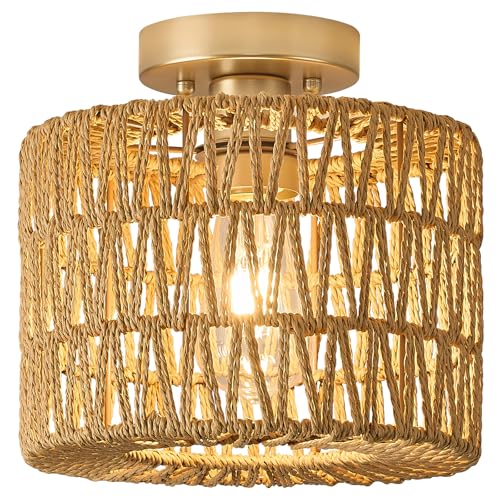 Ceiling Light Fixture,Hand-Woven Rattan Flush Mount Ceiling Light,Farmhouse Light Fixtures Ceiling Mount Boho for Hallway Bedroom Kitchen Entryway Living Room