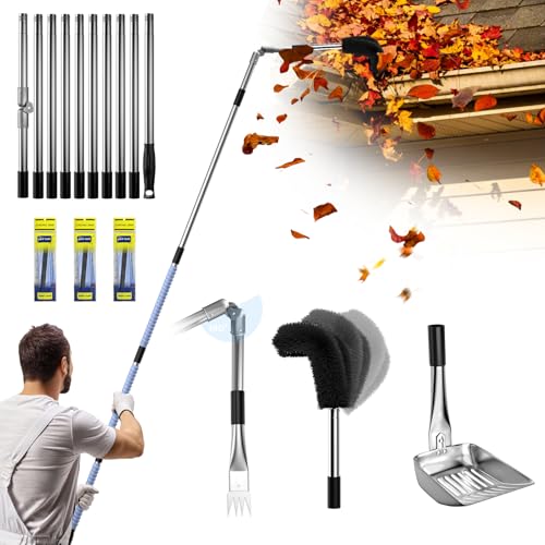 11.8FT Gutter Cleaning Tools from the Ground, No Ladder Needed - Adjustable Gutter Cleaner Pole with Replaceable Brush & Shovel for Roof Rain Gutters Cleans Leaves and Snow with Grip Tapes
