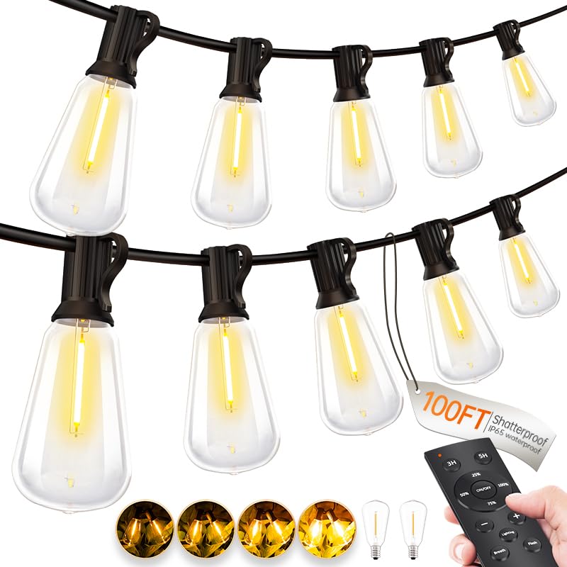 Outdoor String Lights with Remote Control - 100FT ST38 LED Patio String Lights E12 Shatterproof Bulbs Warm White Waterproof Bistro Lights for Backyard Pergola Deck Garden