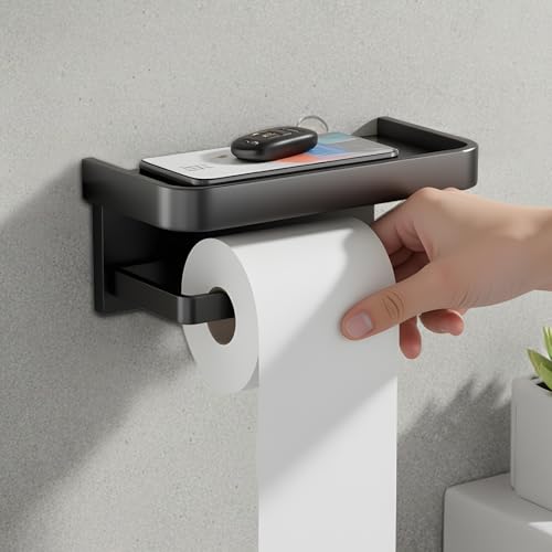 Toilet Paper Holder with Shelf, Matte Black Toilet Paper Holder Wall Mount, Screw or Self Adhesive Toilet Paper Holder, Bathroom Toilet Paper Holder, Toilet Paper Roll Holder for Bathroom,Washroom