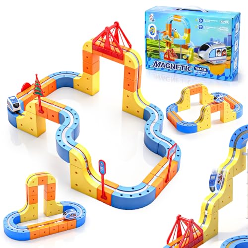 FANPROMS Electric Train Set 3D Flexible Race Track 83 PCS Car Track, Magnetic Track Car Sets Gravity Defying Train Track Stem Learning Set Gift Cube Track for 14 +