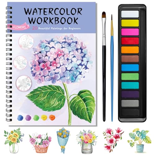 Watercolor Workbook with Step-by-Step - 12 Watercolor Coloring Pages - 100% Cotton 300gsm/140lb Watercolor Paper - Gift for Women, Adults, Beginners (Flower)