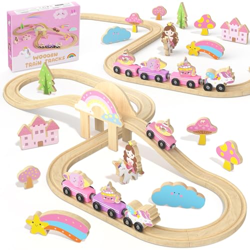 Wooden Train Set Toddler Toys - 38 Pcs Wood Train Track Set for Toddlers 3-4 Years with Crane, Bridge & Accessories - Compatible with All Major Brands