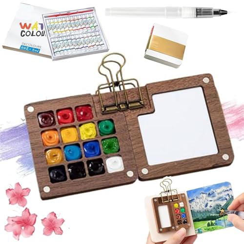2025 Upgrade Mini Watercolor Kit, Pocket Artist Watercolor Set, Travel Water Color Set with 24 Color Paints, for Artists, Beginners & Painting Enthusiasts (Wooden-8 grids + 12 watercolors)
