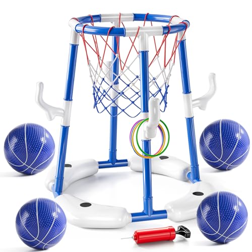 SITODIER Pool Basketball Hoop, 2-in-1 Floating Pool Water Play Toys and Ring Game with 4 Balls and Pump, Outdoor Summer Swimming Pool Basketball Games Family Party for Kids Adults (Blue)