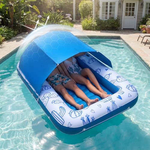 Inflatable Pool Floats with UPF50+ Canopy Adjustable, Large Floating Adult Chair Raft with 2 Cup Holders, Perfect for Swimming Pool, Beach, Lake, Party - Dark Blue