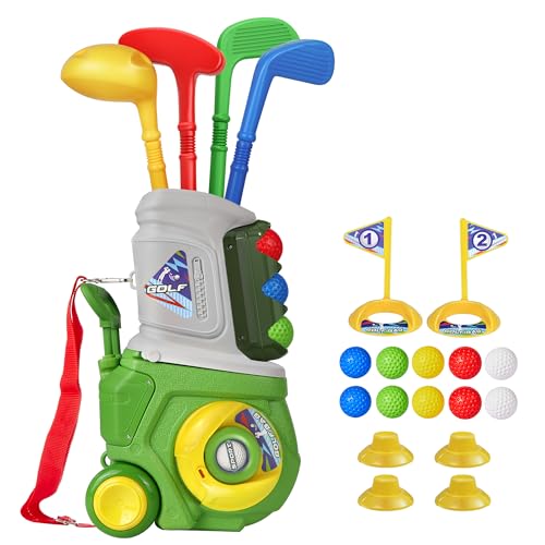 PJG Toddler Golf Set with Mat, Plastic Kids Golf Clubs Ages 1 2 3 4 5 Years Old with 4 Golf Clubs and 10 Balls, Toddler Golf Toys with Cart for Boys and Girls Birthday