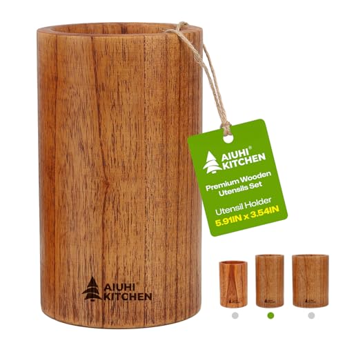Wooden Kitchen Utensil Holder with 4 Compartments, Wooden Utensil Organizer with Drainage Bottom, Cooking Storage Utensils Caddy for Farmhouse Countertop Decor, 11.8 x 4.5 x 5.9 Inch (Burlywood)
