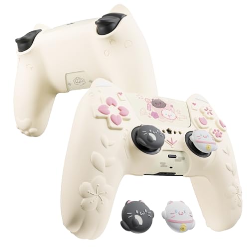 PlayVital for PS5 Controller Cover Skin - Cherry Blossoms Kitten Anti-Slip Grip Skin with Thumb Grip & Sticker - Soft Rubber Protector for PS5 Controller Accessories - Antique Yellow