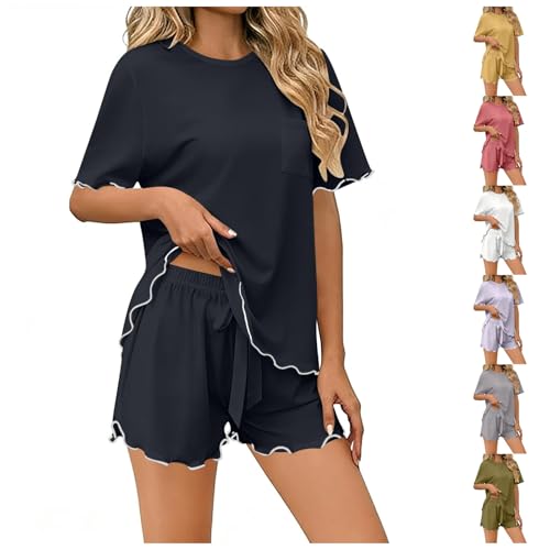 Pajama Sets for Women 2 Pieces Ruffled Lounge Sets Short Sleeve Shirts and Shorts Sleepwear with Pockets