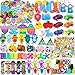 • Premium Party Favors Toys Set: 117 pcs party favor toys for kids 6-8-12, include 4 pop bracelets, 4 cute pop toys keychains, 4 mini pop keychains, 5 tumbler toys, 5 mochi squishy toys, 5 sticky hands, 5 animal pull back cars, 5 pull back planes, 5 finger spinners, 5 mini skateboards, 10 slap bracelets, 60 stickers.