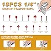 - 15PCS 1/4" Router Bits Kits: This is a professional tool for woodworking file specially designed for woodworking, equipped with 15PCS bits, you can choose different bit in different scenarios. Wood case router bits includes straight bit, V groove bit, dovetail bit, round bit and so on.A variety of accessories can meet different needs, so that you can better complete the woodworking work.