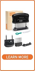 DePango detachable meat blade tenderizer 48 multi-blade needles penetrate meat, and break the meat tissue fibers, then create tinny channels, which can turn a tough steak into a very tender cut of meat without losing any of the juiciness. The cookment meat tenderizer kitchen tool works well on all types of meat, like steak, beef brisket, chicken breast, pork chops, london broil, boston butt, lamb and duck...