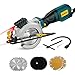 - Package Contents: 1* Mini Circular Saw Blue, 6*115mm Saw Blades (2* 24T Carbide Blade for woodcuts, 2* 60T HSS Blade for wood and soft-metal cuts, 2* Diamond Blades for tile cuts), 1*Wrench, 1*Rip Guide, 1*Vaccum Adapter, 1*User Manual.