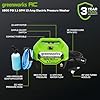 Welcome to a Life. Powered. By Greenworks. The world’s most powerful residential electric pressure washers A fine addition to your tool collection, this electric power washer is ideal for everyday high-pressure cleaning jobs around the house. Whether it's the car, the house, the deck or the driveway, your stuff is sure to shine again. The Greenworks 1800 PSI Pressure Washer is sure to impress. Boasting up to 1.1 GPM of water flow, it's powerful, reliable and built for everyday cleaning. With a hassle-free push-button start, it powers up easily and gets to work fast. It's equipped with an extra-long 35-ft power cord with in-line GFCI and water-resistant power plug, hassle-free kink-resistant hose that eliminates frustrating hose tangles, portable design for easy transportation, and on-board accessory storage. This unit includes a variety of quick connect tips and a soap attachment for a variety of cleaning applications. Backed by a 3-year tool warranty, it's built to last for years to come.