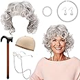 Product Summary: HEQU 9 Pcs Old Lady Costume Set Grandma Granny Wig Cosplay Set Old Lady Cosplay Pearl Necklace Grey Wigs for Women