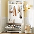 Product Summary: HOOBRO Hall Tree with Bench, Entryway Bench with Coat Rack and Shoe Cabinet, Flip Drawers, Farmhouse Hall Tree with Shoe Organizer, Mud Room, White and Walnut WH85MT01