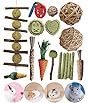 - 18 DIFFERENT CHEW TOYS: A nice assortment of hay and wild flower pressed chews,apple stick chews,bamboo sticks chews and rope type chews.YIXUND rabbit toys includ 3 heart green timothy biscuits,2 green dried grasses balls,2 lollipops,1 seagrass ball,1 wicker ball,1 apple wood molar string,1 wicker carrots,apple sticks,sweet bamboo sticks and timothy hay sticks.
