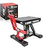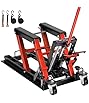 - High Quality: This heavy duty solid steel motorcycle stand lift with a red powder coating to prevent rust and is much easier to clean up after repairs.Motorcycle lift table also has a durable rubber pad with striped veins to help prevent slippage and scratches.