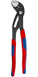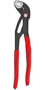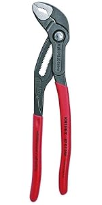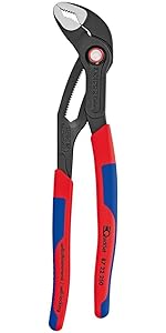 This 10 inch tool is a great addition to the cobra family of water pump pliers. With a distinctive blue push button this cobra automatically grips on the workpiece by sliding the upper handle to set it on the workpiece. This is a great tool when you have limited visibilty or cannot reach what you are working on because all you have to do is push the button down and open the jaw completely, set the top jaw on the workpiece and then slide the upper handle to securely grip onto the workpiece.